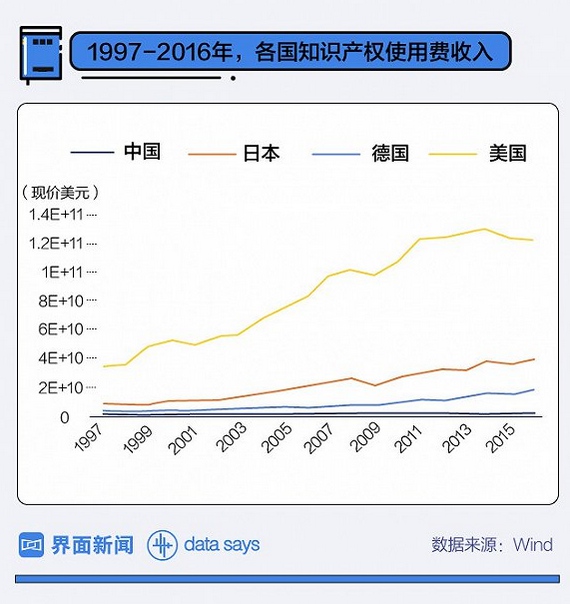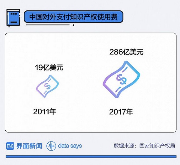 去年,中国对外支付的知识产权使用费逆差超过200亿美元(约合人民币1265亿元),而美国每年对外许可知识产权净收入金额近800亿美元(约合人民币5059亿元)。
