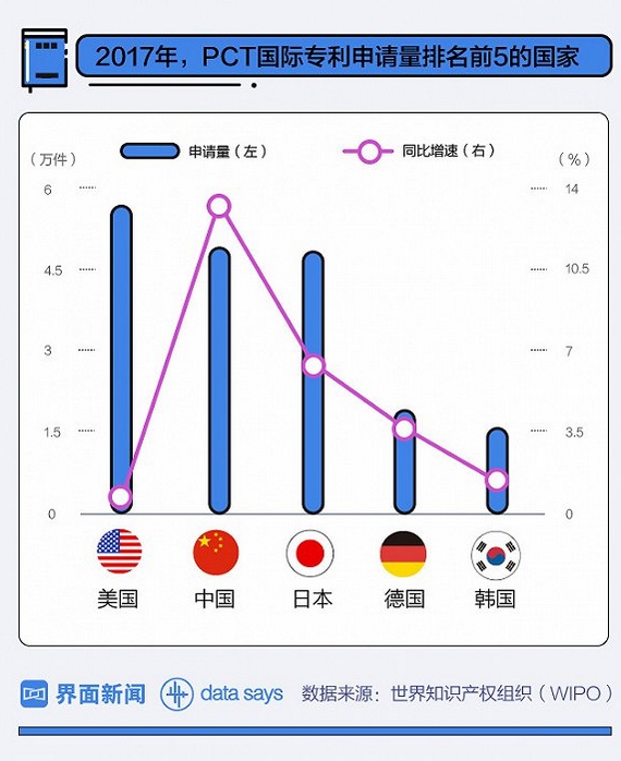 另据,世界知识产权组织(WIPO)公布消息称,2017年中国提交的PCT国际专利申请量首次排名全球第二。在PCT国际专利申请量前15的原属地中,仅有中国和印度是两个中等收入国家。且2017年中国发明专利申请量达138.2万件,连续7年位居世界首位。