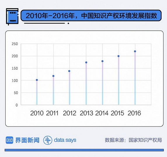 中国知识产权环境发展指数从2010年的100分提至2016年的216.9分。2017年中国进一步修订《反不正当竞争法》,加强对商业秘密的保护,美国知识产权权威人士和有关媒体也表示,中国的知识产权保护环境得分居于中等收入国家前列。