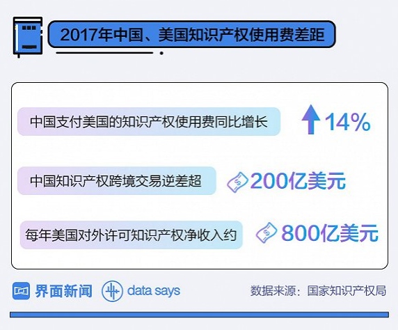 中国知识产权相较其他国家仍有较大差距。2017年,中国对外支付的知识产权使用费逆差超过200亿美元。而美国每年对外许可知识产权净收入金额都近800亿美元。
