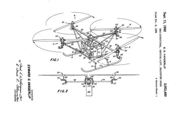 Vanderlip然后产生了将飞行员友好飞行系统吸收进远程遥控的螺旋桨飞行器的想法。他的“全向、直升式直升无人机”大概描述了一个飞行“极其简单”的UAV。该无人机设计有“4个成对安排在对端的升力旋翼”所以俯仰的垂直轴总是垂直于地面的。这使得飞行器可以倾斜旋翼以任意方向飞行同时还能保持水平平台。