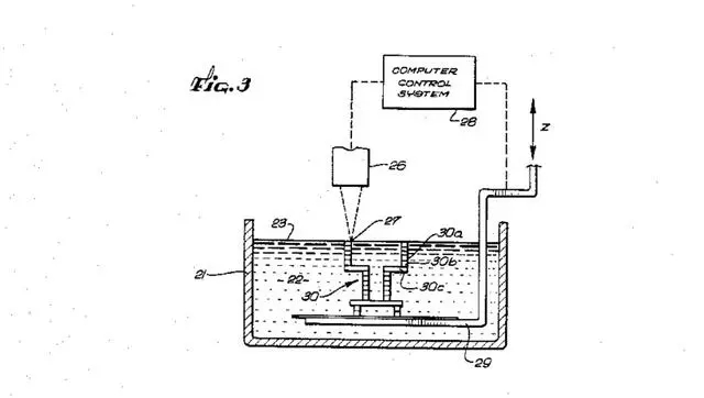 1986年颁布的这项3D打印机专利领先于它的时代。文档概述了大多数3D打印机使用的基本技术:立体平版印刷,或者树脂的光固化。一个活动平台接受计算机的输入然后将基座放置在一个喷嘴下方。喷嘴的液体树脂一层层地形成物体,再由紫外光来固化。